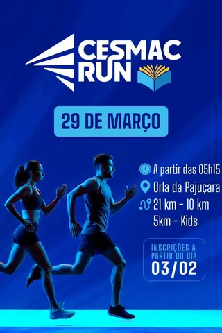 O Centro Universitário Cesmac anunciou a realização da Cesmac Run, a primeira corrida de rua promovida pela instituição, que será no dia 29 de março, com largada às 5h, na orla da Pajuçara, em Maceió. O evento terá percursos de 5 km, 10km e 21km, contemplando desde corredores iniciantes até atletas experientes.