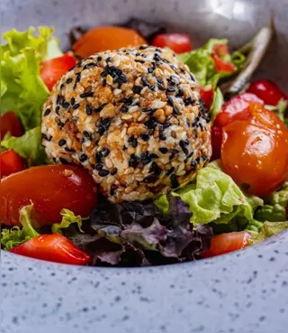 Entre as entradas, opções que já chegam despertando curiosidade e abrindo o apetite. Uma delas é o Mix de folhas com esfera de ricota envolvida em nuts, morango e tomate cereja. A textura cremosa da ricota encontra o toque crocante das nuts e recebe por cima um fio de mel que conversa muito bem com o frescor do morango. Uma combinação elegante e muito equilibrada.
